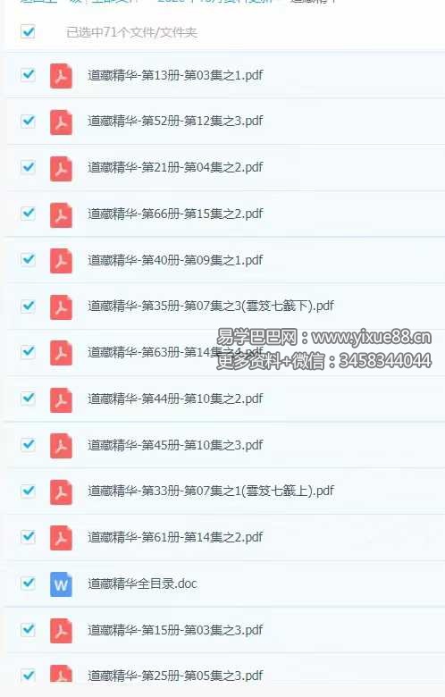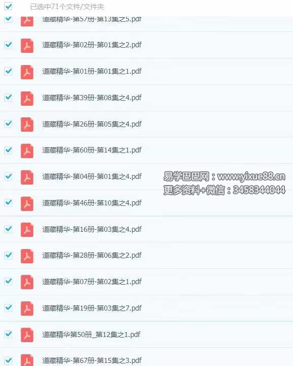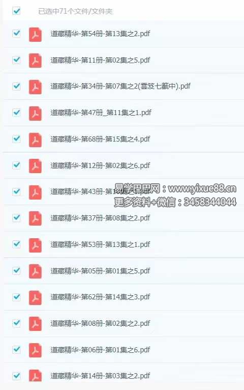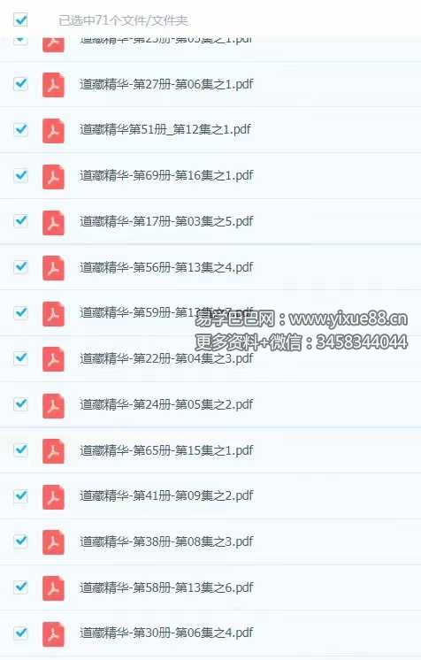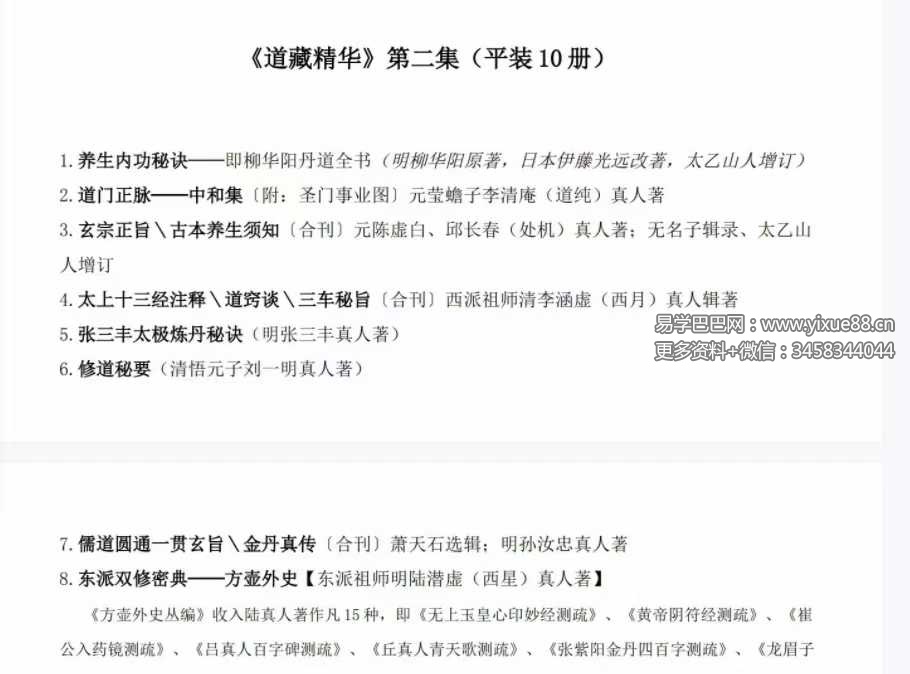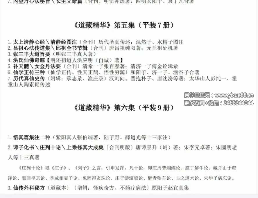 正文概述 课程编号:Y2508090 道藏精华70册 电子书合集 道藏精华 服务说明: (1)、资源来源于网络公开发表文件,所有资料仅供学习交流; (2)、学分仅用来维持网站运营,性质为用户友情赞助,并非购买文件费用(1元=1学分); (3)、如遇百度网盘分享链接失效,可以联系客服,管理员都会及时处理的或将资料发送至您提交的邮箱; (4)、在您未收到文件之前,可以联系客服QQ:529202210 进行退款; (5)、不用担心不给资料,如果没有及时回复也不用担心,看到了都会发给您的!放心!国学资源学习网 » 道藏精华70本 常见问题FAQ 免费下载或者VIP会员专享资源能否直接商用? 本站所有资源版权均属于原作者所有,这里所提供资源均只能用于参考学习用,请勿直接商用。若由于商用引起版权纠纷,一切责任均由使用者承担。 付款之后,如何获得资源? 国学资源网网的资源,均为百度网盘下载,付款之后,点击立即下载,即可跳转百度网盘下载链接,输入密码,就可以提取资料了。 下载链接失效了怎么办? 如遇百度网盘分享链接失效,千万不要着急,联系客服QQ:529202210,我们会第一时间给您发资料,不用担心不给资料,如果没有及时回复也不用担心,看到了都会发给您的!放心!